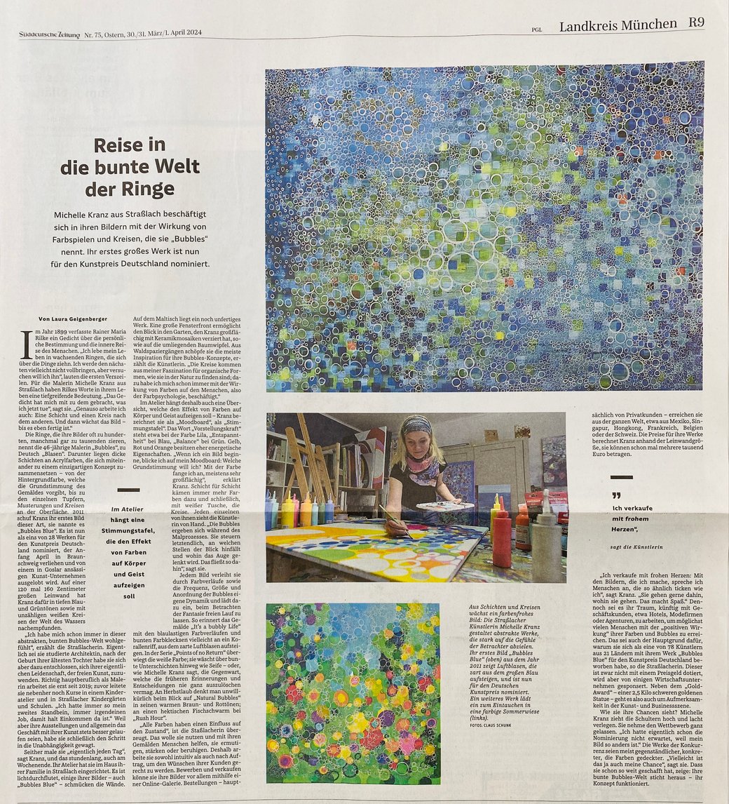 Die runde Form des Kreises hat eine beruhigende und ausgleichende Wirkung auf uns Menschen. Sie symbolisiert Unendlichkeit und Harmonie. In der Natur finden wir organische Formen wie Zellen oder Blasen, die ebenfalls kreisförmig sind. Der Betrachter wird durch das Anschauen von Kreisen die über die Bildfläche wachsen regelrecht auf Reisen zu sich selbst geschickt - ich nenne sie "Bubbles".