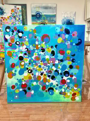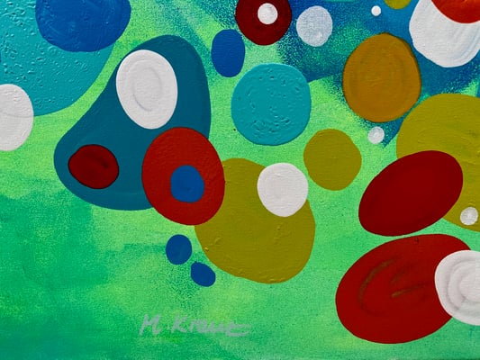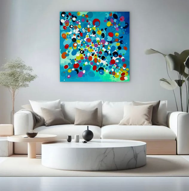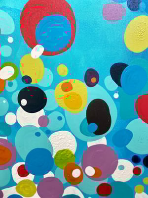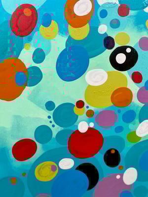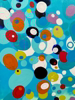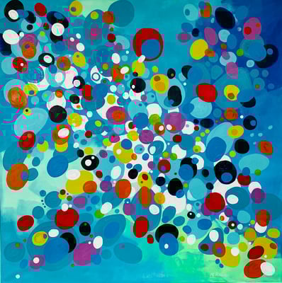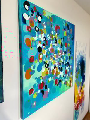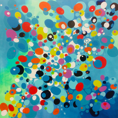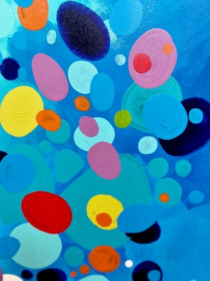 Dieses Kunstwerk ist eine bunte Farbexplosion mit einer Wirkung voller positiver Energie. Besonders liebe ich Kreise! Mit ihnen kann ich all meine Stimmungen und Gedanken zum Ausdruck bringen. Blau bildet dabei eine wichtige Basis und verleiht den Bildern Tiefe. Es wirkt beruhigend und stellt gleichzeitig einen perfekten Kontrast zu anderen Farben dar. Wie Seifenblasen lasse ich die bunten Kreise darauf landen und erstrahlen - während des Malprozesses bin ich absolut präsent im Moment.