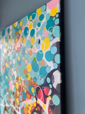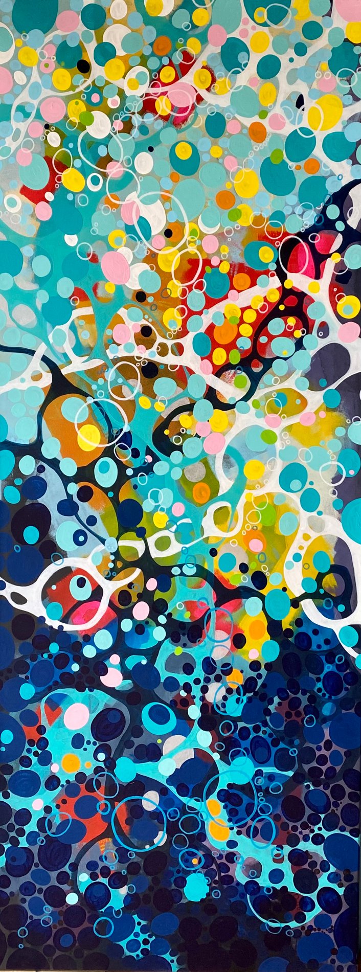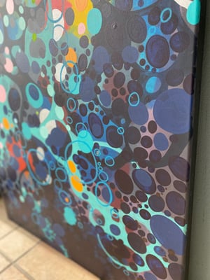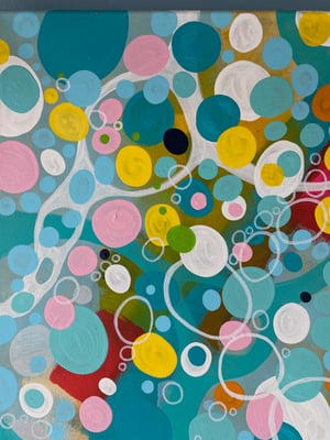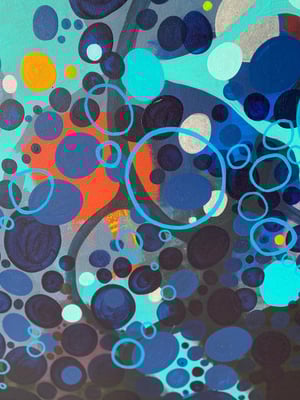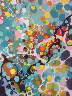 In meiner eigenen Welt, in der ich mich wie in einer Blase befinde, sehe ich nur das, was ich sehen möchte und will auch nur das haben. Alles ist harmonisch aufeinander abgestimmt - Hell und Dunkel gehören zusammen und wechseln sich ab wie Licht und Schatten. Die Farbwirkung zeigt bunte Kreise, die aufsteigen und sprudeln wie Gedanken während einer Reise von dunklen zu hellen Momenten zurück zur positiven Energie.