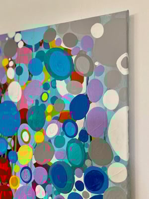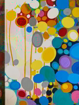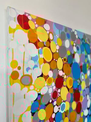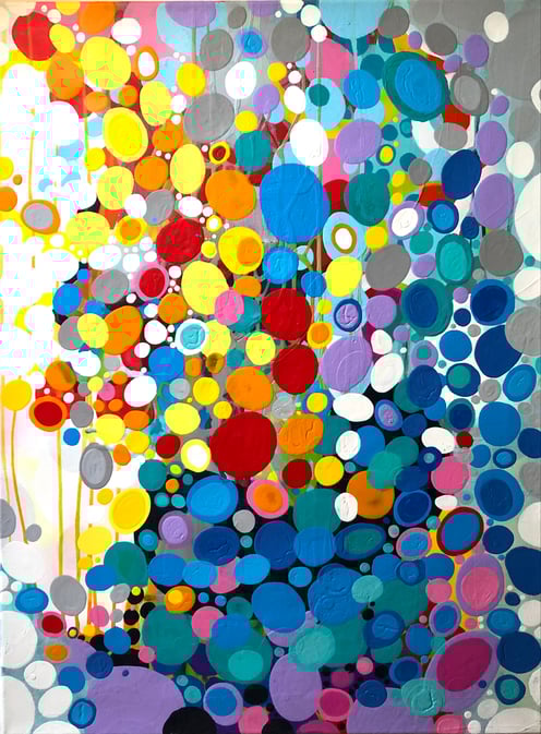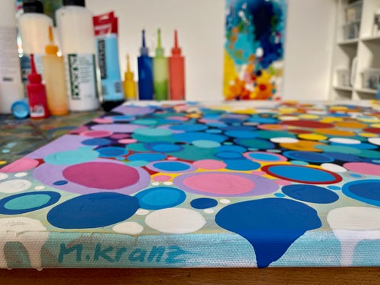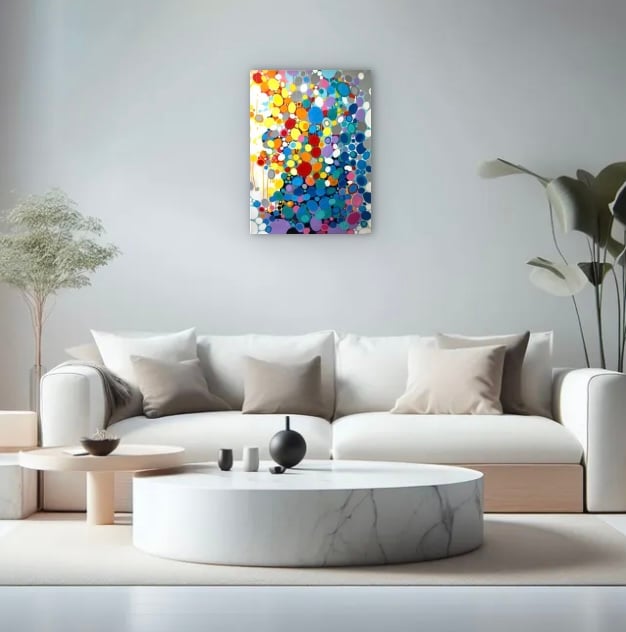 Das bunte Kunstwerk mit seinen kreisförmigen Formen strahlt eine positive Leichtigkeit aus. Es erinnert uns daran, jeden Tag zu lächeln und das Leben leichter anzugehen. Wenn wir achtsam und freundlich mit uns selbst umgehen, werden auch andere Menschen positiv auf uns reagieren - unser Leben wird stressfreier. Also lass dich von diesem bunten Werk inspirieren und beginne den Tag stets mit einem Lächeln!