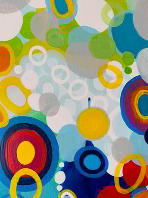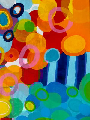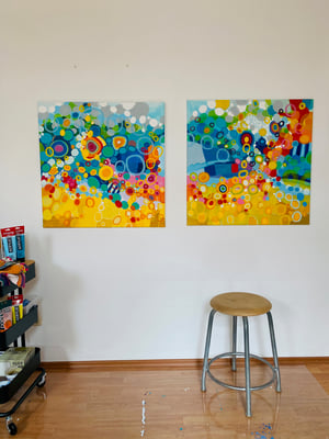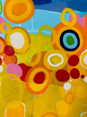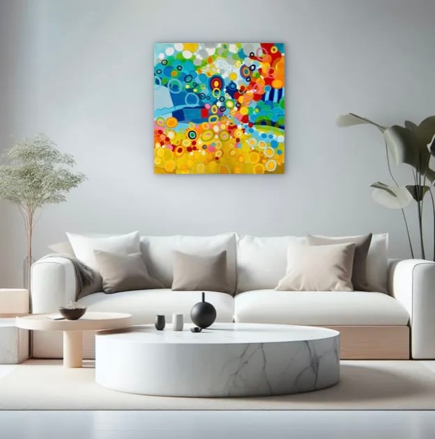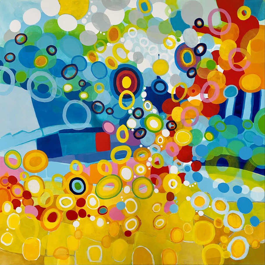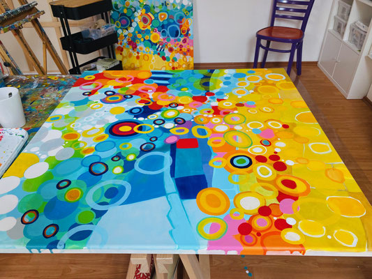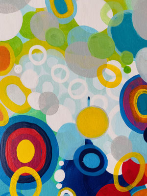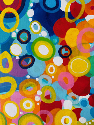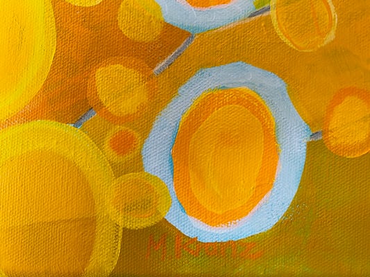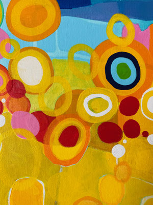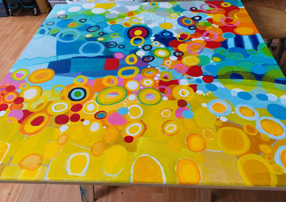 In meiner Arbeit fließen Leidenschaft und Dynamik zusammen, um ein Gefühl von Freude und Energie zu erschaffen. Mit Acryl und Tusche auf Leinwand bringe ich einen abstrakten Tanz aus Farbe zum Leben. Die leuchtenden Kreise und lebhaften Farbübergänge in diesem Gemälde laden zu Optimismus und Inspiration ein; sie sollen Wärme und positive Schwingungen in jeden Raum bringen, der mit dieser Kunst belebt wird. Klar, inspiriert von "Fields of gold" von Sting, einfach das Sein genießen!