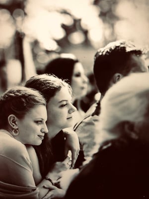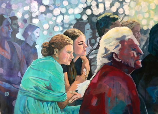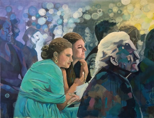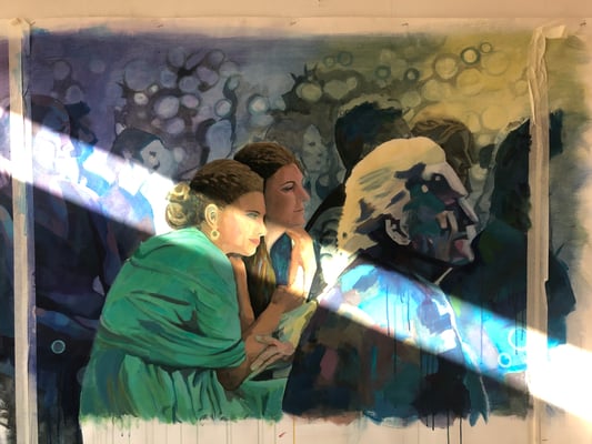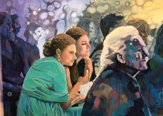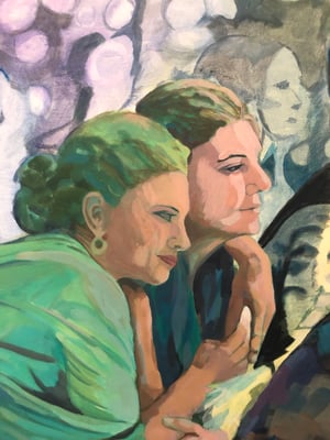 Dieses Kunstwerk fängt die innige Bindung zwischen zwei Schwestern bei einer Hochzeit ein. Gemeinsam lauschen sie der berührenden Zeremonie, eingerahmt von Kreisen, die für unendlich gute Energien stehen. Sie symbolisieren die Leichtigkeit dieses Moments und die Verbundenheit zwischen den Beiden. Es ist ein sehr persönliches Motiv, das meine beiden Töchter zeigt. Diese Darstellung vermittelt ein Gefühl von Harmonie und Wärme.
